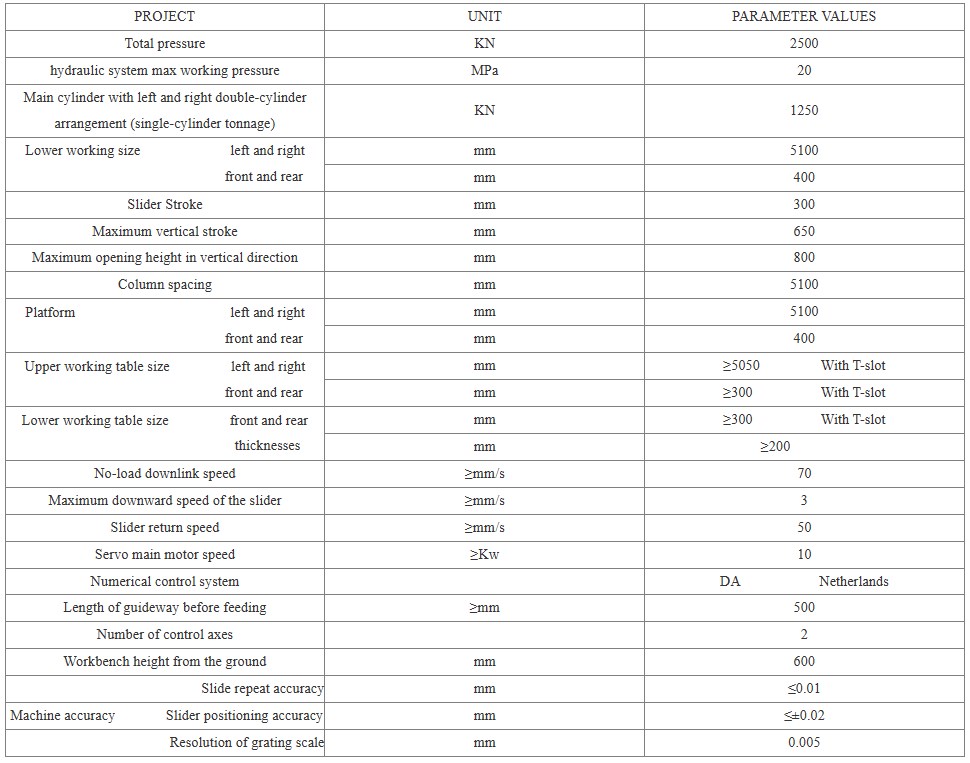 2、The electro-hydraulic servo synchronization method is used to ensure the synchronization of the oil cylinder. The synchronization performance is good, the anti-bias load capacity is strong, and the debugging is simple. The two oil cylinder stroke Y1 and Y2 are controlled separately, and two grating ruler are used to detect the displacement of the slider. The positioning accuracy can reach 0.02 mm, and the repeated positioning accuracy is 0.01 mm.